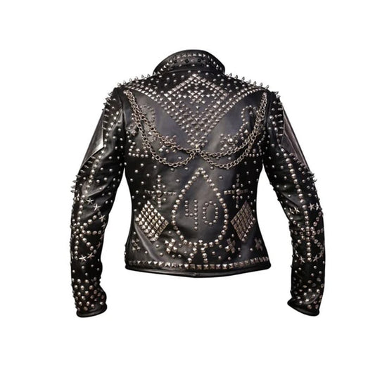 Handmade Women Black Leather Rock Women Steam Punk Style Studded Biker Jacket Silver Long Studs Spiked Jacket (389)