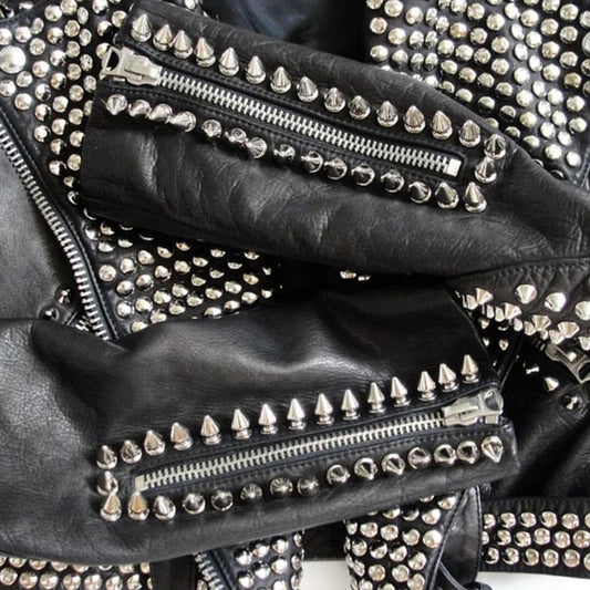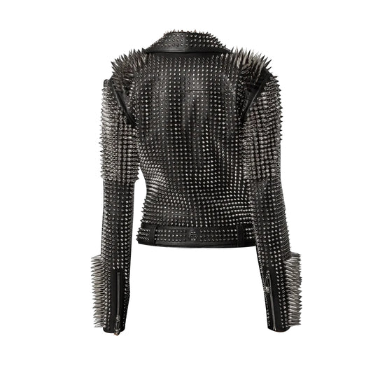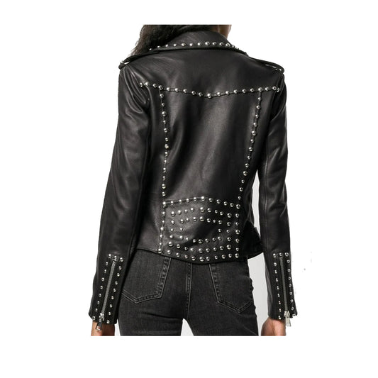 Women Silver Studded Leather Jacket Spiked Silver Color Studs Real Leather Black Leather Jacket