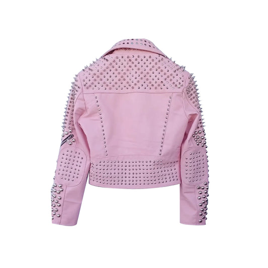 Women Pink Studded Leather Rock Steam Punk Style Biker Jacket, Women Silver Studs Spiked Pink Jacket